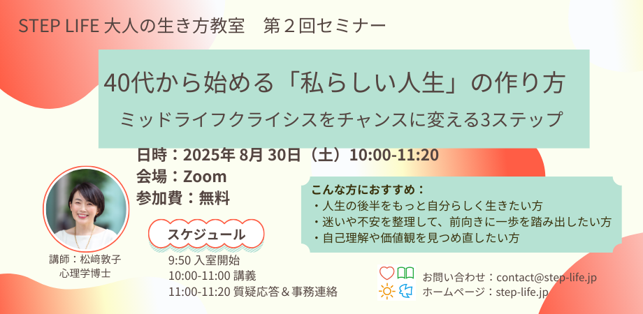 【主催者:ステップライフ】 人生100年時代といわれる今、「人生が思うようにいかない」「もっと充実させたいのに、どうすればいいのかわからない」そんな悩みやモヤモヤを抱える方は少なく... powered by Peatix : More than a ticket.