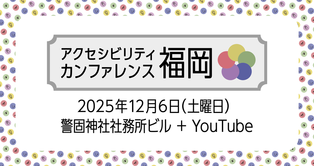 # アクセシビリティカンファレンス福岡とは? アクセシビリティの実践知を共有するカンファレンスです。 2024年は実際にどのように取り組んでいくか?に焦点をあて、「次の一手」「これからの取り組み」を示唆しました。 2025年は様々な分野からアクセシビリティの具体的な取り組み、現場での学びや発見を共有していただきます。 セッションを通して視野を広げ、今の自分たち自身の取り組みやぶつかっている壁を見つめ直すことを示唆します。 また、それぞれの現場での取り組みに学びや発見を活かせるように、今後も共に取り組める仲間とつながる場にしてもらいたいと考えています。 # 開催概要 ...