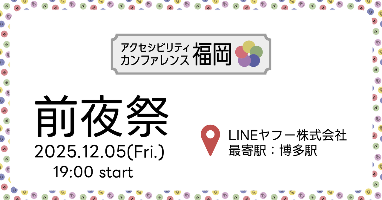 ## 前夜祭を楽しみましょう!🎉 アクセシビリティカンファレンス福岡を前日から盛り上げるイベントとして、前夜祭を開催します! 福岡に遠征してくる人、福岡に住んでいる人、当日は行けないのでオンラインで参加する人なども、みんなでアクセシビリティカンファレンスを楽しんでいきましょう! 当日参加できない方も、前夜祭のみの参加が可能です。お気兼ねなくお申し込みください。 ## 会場 LINEヤフー株式会社 福岡県福岡市博多区博多駅前4-14-1 博多深見パークビルディング3階 ## 開催日時 2025年12月5日(金) 19:00~21:30 (受付開始 18:30) イベント申し...