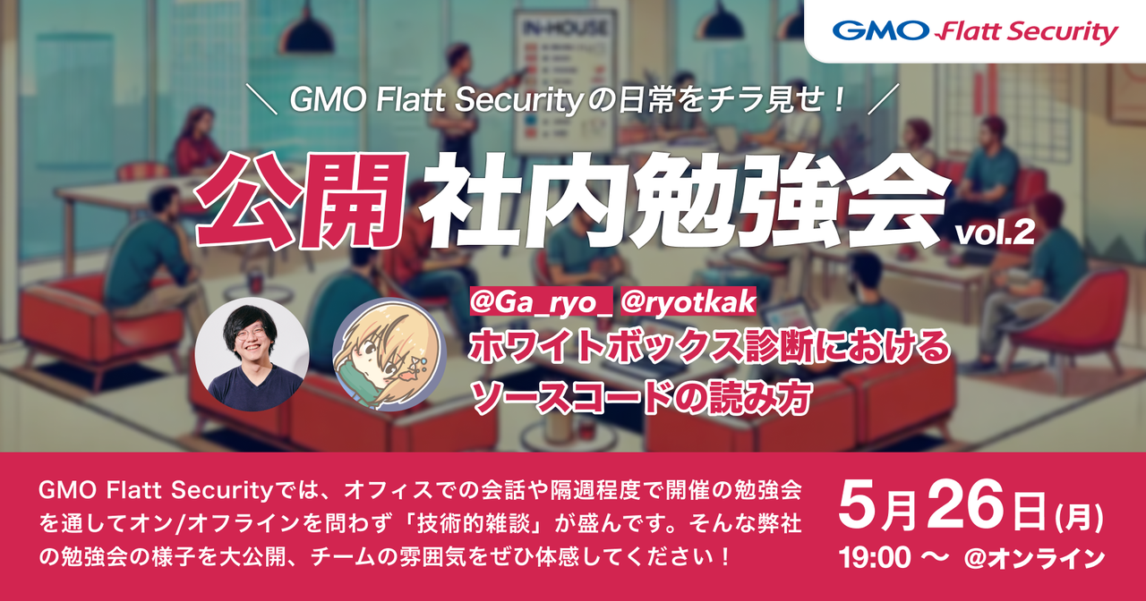 # ✍️ イベント概要 前回およそ100名の方にご参加いただき、大盛況だった公開社内勉強会を 再び開催 します! GMO Flatt Security の脆弱性診断の強みといえば、業界でも珍しい「ホワイトボックス診断の全プロジェクトでの標準提供」(※)。常日頃社内ではたくさんのコードリーディングが行われ、知見が蓄積されています。 ※通常、ブラックボックス診断のみが行われ、ソースコードを読むホワイトボックス診断は高額なオプションであることが多いです。 また、3月より提供を開始しているセキュリティ診断AIエージェント「Takumi」もソースコードの解析を大きな強みとしています。セキュ...