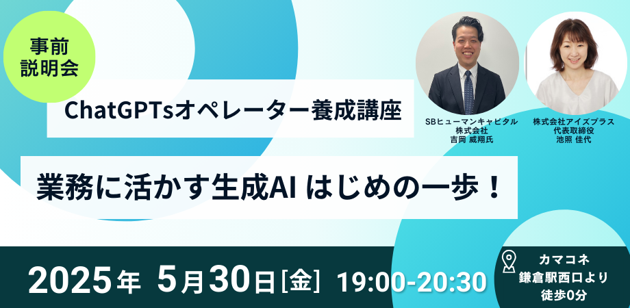 ChatGPTsオペレーター養成講座 《まずは事前説明会》@鎌倉 生成AIの可能性にワクワクしながらも、「何から始めたらいいのかわからない」「業務でどう活かせるかイメー... powered by Peatix : More than a ticket.