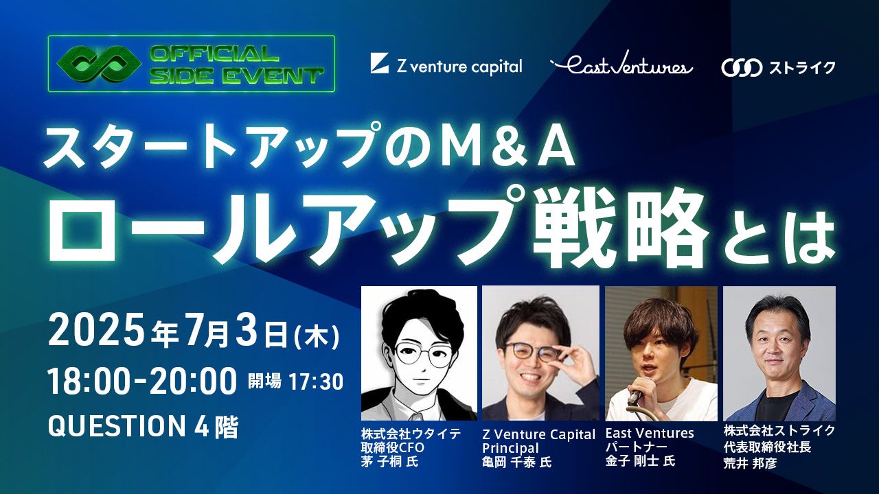 <h2>■スタートアップによるM&A戦略について語る!■<br></h2><p>東証による上場維持基準の見直し方針を受け、バリューを上げるためのM&Aによる買収戦略に熱い目線が注がれています。</p><p>また「ロールアップM&A」は、非連続な成長を実現するモデルとして話題になっています。</p><p></p><p>2.5次元IP開発・運営を行うウタイテは創業2年目ながらも、2024年にM&AによるCynraのグループインを実現し、</p><p>先日シリーズBで77億円の資金調達を発表したことでも話題となりました。今後も成長戦略の柱としてM&A推進を掲げる同社の狙いとは。。。?</p><p><br>本イベントでは、ウタイテ 取締役CFOの茅 子桐 氏をお招きし、急成長の裏側にあるM&A戦略について、Z Venture Capital、East Ventures、ストライクと共に語り尽くします。<br></p><p>そして、なぜ今、IPビジネスが市場を熱狂させるのかについてもお話を伺います!</p><p>成長戦略のヒントが欲しい、全てのスタートアップ関係者の皆様へ。この貴重な機会をお見逃しなく!ぜひお気軽にご参加ください。</p><p><br></p><p>※【登壇者変更の知らせ】<br>この度、本イベントの登壇者に一部変更がございます。<br>ご参加を予定されている皆様にはご迷惑をお掛けいたしますが、何卒ご理解いただけますようお願い申し上げます。</p><p><br></p><p><strong>【開催概要】</strong></p><p>・日時:2025年7月3日(木)18:00-20:00 (17:30開場)</p><p>・会場:Question 4階 Community Steps</p><p>・費用:無料</p><p>・持ち物:名刺<br>※受付、ネットワーキング時に使用いたしますので、余裕を持った枚数をご持参ください。</p><p>【主催】</p><p>East Ventures / Z Venture Capital / ストライク</p><p></p><p>【登壇者紹介】</p><p><strong>・株式会社ウタイテ 取締役CFO 茅 子桐 氏</strong></p><p><a target="_blank" rel="noopener noreferrer" href="https://x.com/ZTMao">@ZTMa</a></p><p><strong>・Z Venture Capital Principal 亀岡 千泰</strong></p><p><a target="_blank" rel="noopener noreferrer" href="https://x.com/ChihiroKameoka">@ChihiroKameoka</a></p><p><strong>・East Ventures パートナー 金子 剛士</strong></p><p><a target="_blank" rel="noopener noreferrer" href="https://x.com/evkaneko">@evkaneko</a></p><p><strong>・株式会社ストライク 代表取締役社長 荒井 邦彦</strong></p><p><a target="_blank" rel="noopener noreferrer" href="https://x.com/MAstrike">@MAstrike</a></p><p></p><p>★☆★☆タイムテーブル★☆★☆</p><p><strong>■開場</strong></p><p>∟17:30~</p><p></p><p><strong>■第1部 トークセッション<br>【エンタメ業界 IP領域の今後の展望について】</strong></p><p>∟18:00-18:40 (40分)</p><p>・株式会社ウタイテ 取締役CFO 茅 子桐 氏<br>・Z Venture Capital / 亀岡 <br>・East Ventures / 金子 </p><p></p><p><strong>■第2部 トークセッション<br>【スタートアップが買い手としてM&Aをする時代】</strong></p><p>∟18:40-19:10 (30分)</p><p>・株式会社ウタイテ 取締役CFO 茅 子桐 氏<br>・East Ventures / 金子<br>・ストライク / 荒井 </p><p></p><p><strong>■ネットワーキング</strong></p><p>∟19:10-20:00 (50分)</p><p>ドリンクを片手にお楽しみください!</p><p>★☆★☆★☆★☆★☆★☆★☆★☆</p><p></p><p>皆様のご参加をお待ちしております!</p>