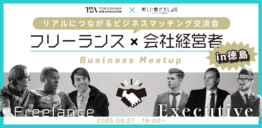 ## 【概要】 今回は新しい働き方LABとTWA徳島ウェブアソシエーションとのコラボ企画です。 フリーランスと経営者がリアルに出会い、対話し、つながるビジネスマッチング交流会を開催します! 単なる名刺交換や自己紹介にとどまらず、双方が本音で聞き合える、双方向のコミュニケーションを重視したイベントです。 フリーランスにとっては、自分のスキルや強みを直接アピールし、経営者や会社役員のニーズをリアルに知るチャンス。経営者にとっては、気軽に相談できる外部パートナーや将来の協業相手と出会える貴重な機会です。 参加者同士のつながりを大切にした雰囲気づくりを心がけており、初参加の方でも安心してご参加...