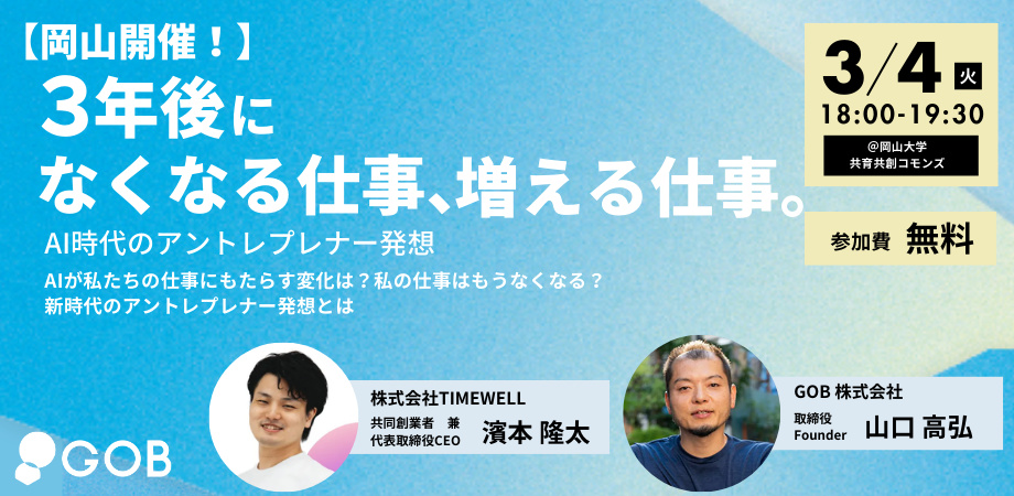 【初開催!TIMEWELL×GOB トークイベント!】 ※このイベントはオフライン開催のみです。現地でお会いできるのを楽しみにしております。 AIが私たちの仕事にもたら... powered by Peatix : More than a ticket.