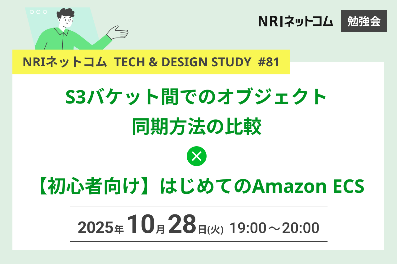 今回のTECH & DESIGN STUDYでは、当社エンジニアから「S3 バケット間でのオブジェクト同期方法の比較」と、「【初心者向け】はじめてのAmazon ECS」についてお話します。 #### 【1人目】S3 バケット間でのオブジェクト同期方法の比較 2 つの Amazon S3 バケット間でオブジェクトコピー・同期させる、というニーズはさまざまな文脈で存在します。 各環境にある S3 バケットの中身を揃えたい、ワークフローのトリガーとしたい等、多様なユースケースが考えられます。 この実現には AWS CLI・SDK や S3 Replication、AWS Da...