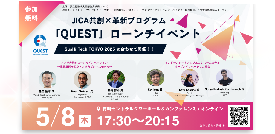 共創と革新による世界の社会課題解決を目指した共創×革新プログラム「QUEST」は、企業、自治体、市民社会、アカデミアなど多様なアクター連携を通した、イノベーティブな共創... powered by Peatix : More than a ticket.