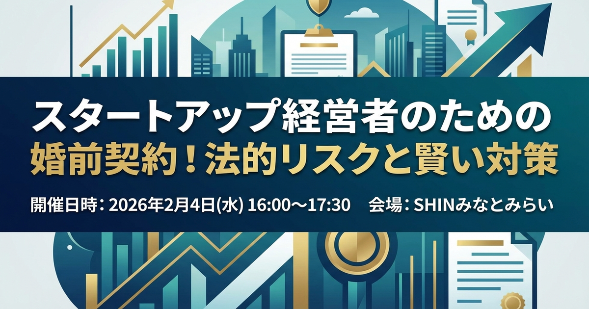 スタートアップ経営者の皆様、ご自身の未来と会社の安定のために「婚前契約」について考えたことはありますか?本勉強会では、みなとみらい総合法律事務所の専門家をお招きし、スタートアップにおける婚前契約の重要性、法的側面、そして具体的なリスク回避策について解説いただきます。